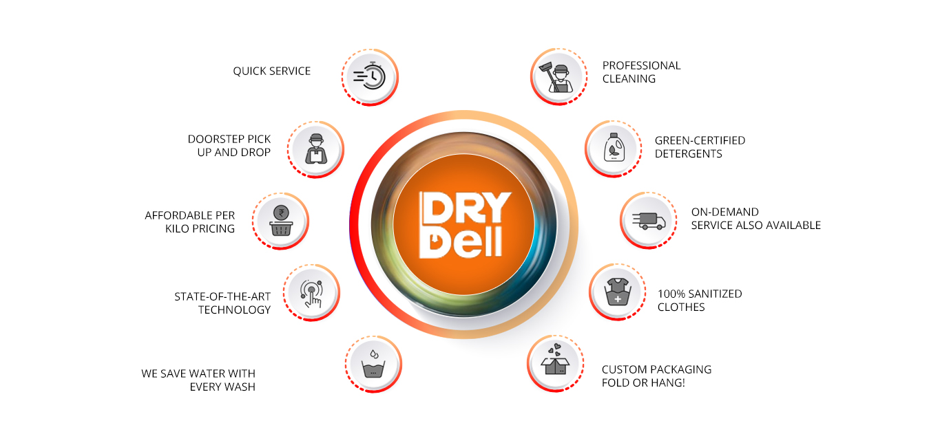 The largest laundry and dry-cleaning chain in India, DryBell, runs a network of more than 300 small launderettes in 85+ cities. Your local DryBell location provides live laundry, steam ironing, and dry-cleaning services, free home pick-up, and a guarantee that your items will be delivered in less than 24 hours*.